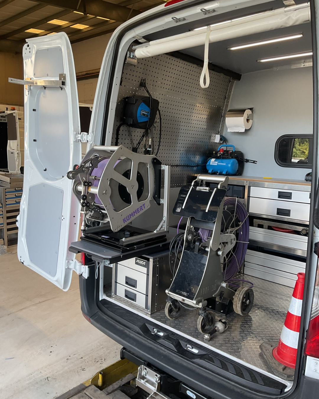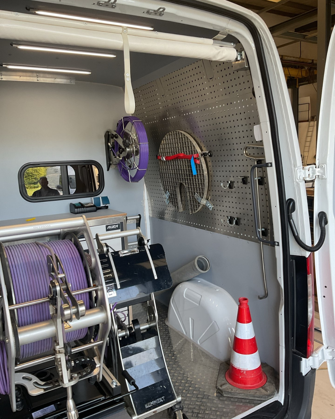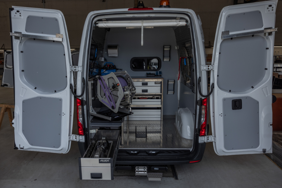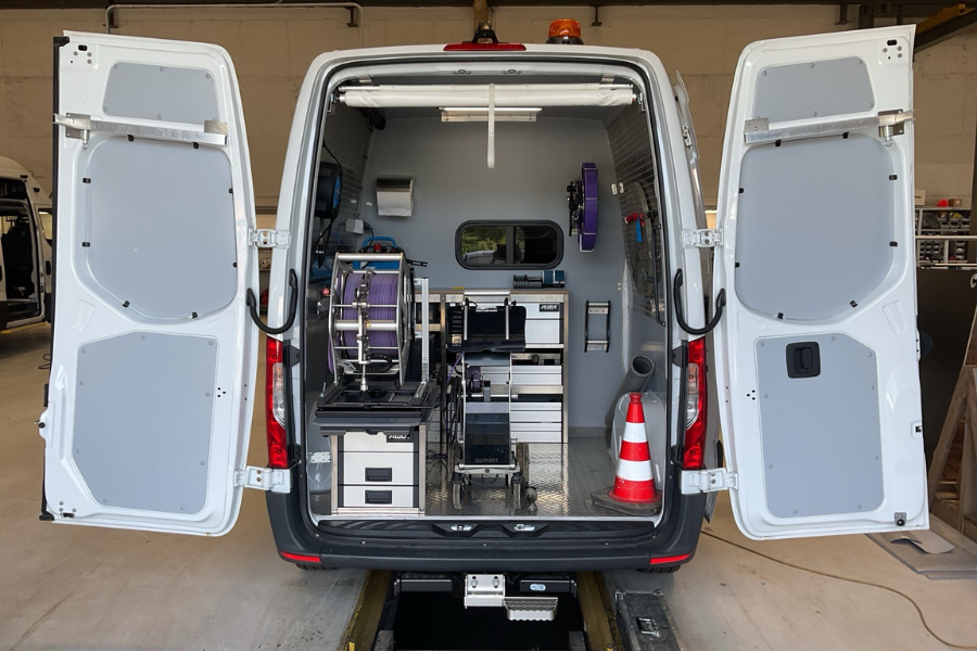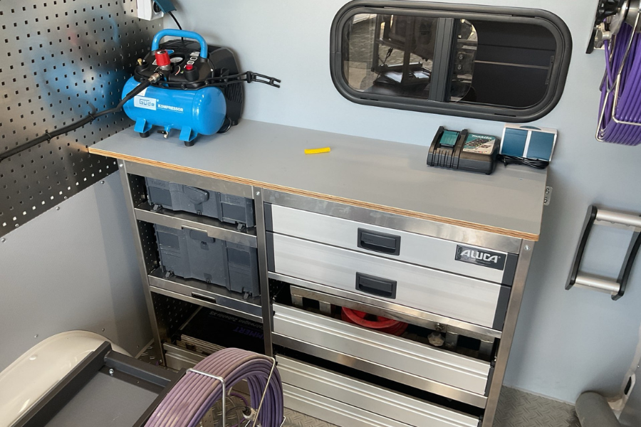 Wir haben den Kamera-TV-Wagen für Rohr- und Schachtkontrollen so ausgestattet, dass Funktionalität und Sicherheit Hand in Hand gehen. Der Bürobereich ist klar vom Laderaum getrennt, während teures Equipment sicher verstaut und gleichzeitig schnell einsatzbereit ist. Zusätzlich bietet der Ausbau großzügige Stauflächen für Sondermaterialien. Highlights bei dem Fahrzeug sind zum einen die einstellbare Drehkonsole auf dem Schwerlastauszug mit einer Halterung für die Kabeltrommel auf der Schublade für den Kamerawagen und zum anderen das Heckrollo als Regenschutz.