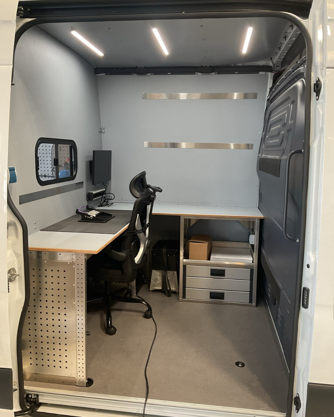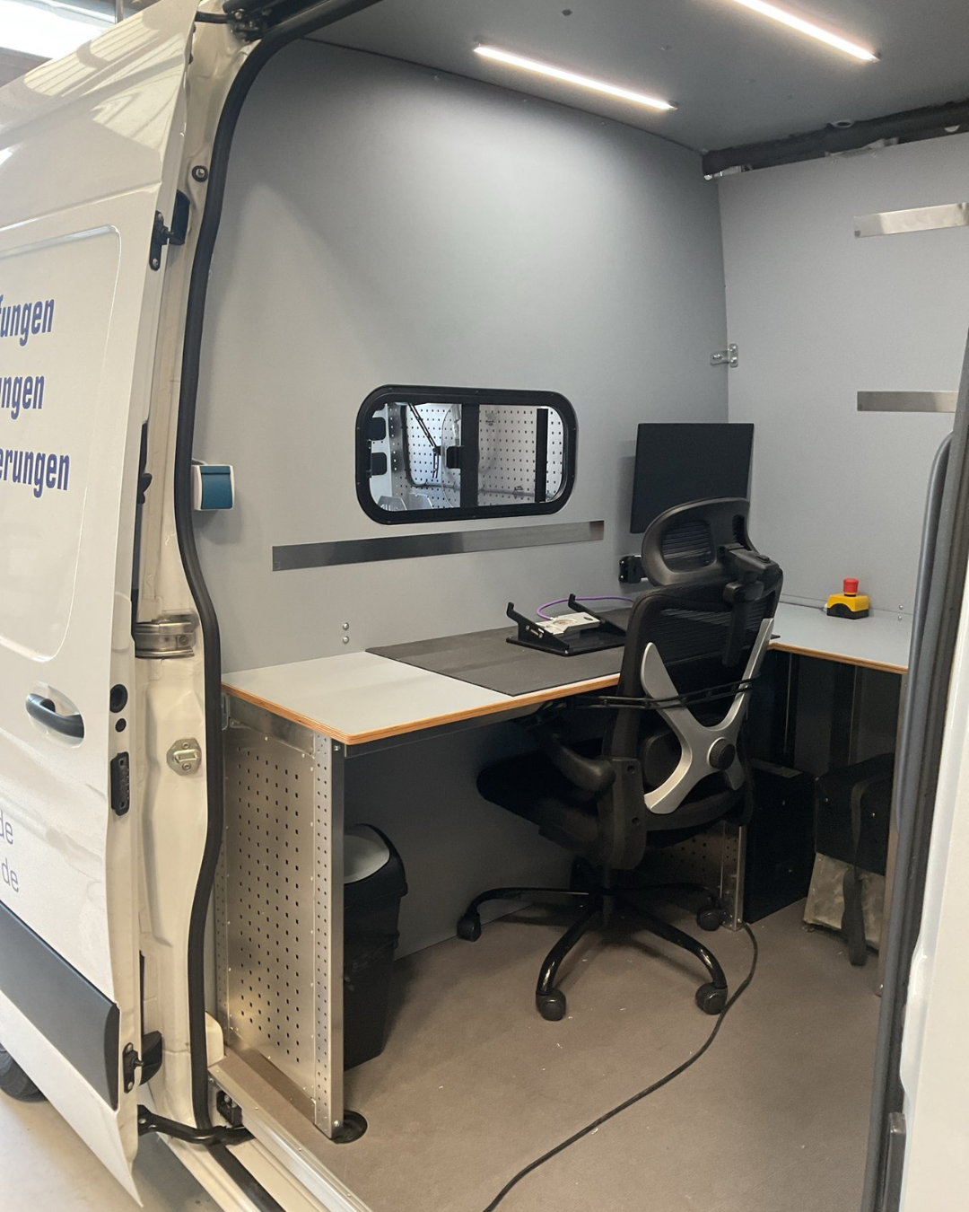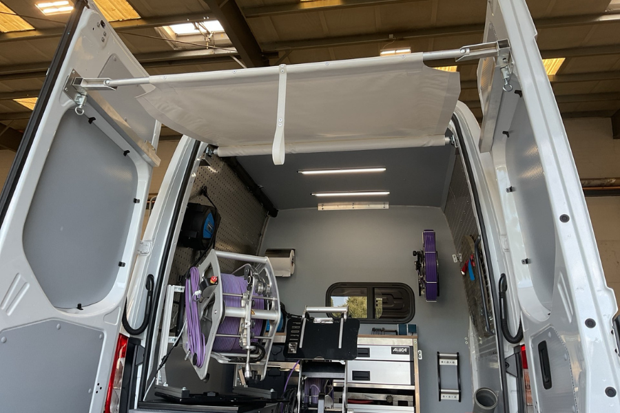 Wir haben den Kamera-TV-Wagen für Rohr- und Schachtkontrollen so ausgestattet, dass Funktionalität und Sicherheit Hand in Hand gehen. Der Bürobereich ist klar vom Laderaum getrennt, während teures Equipment sicher verstaut und gleichzeitig schnell einsatzbereit ist. Zusätzlich bietet der Ausbau großzügige Stauflächen für Sondermaterialien. Highlights bei dem Fahrzeug sind zum einen die einstellbare Drehkonsole auf dem Schwerlastauszug mit einer Halterung für die Kabeltrommel auf der Schublade für den Kamerawagen und zum anderen das Heckrollo als Regenschutz.